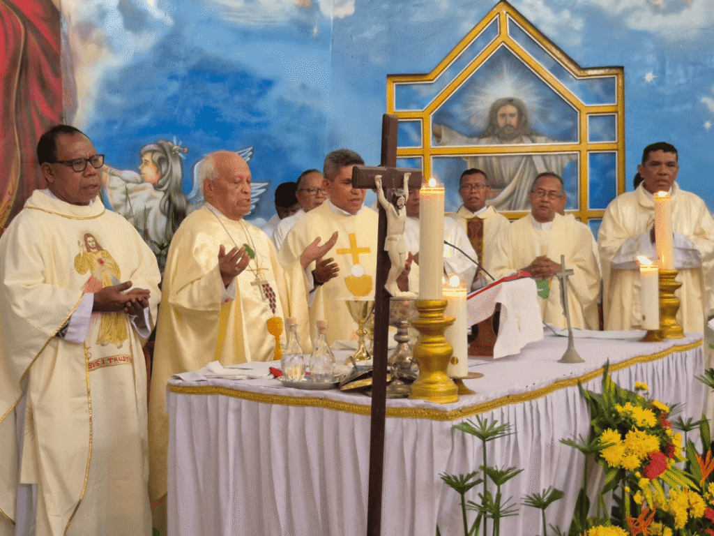 LEWOMUDA – Stasi Kristus Raja Lewomuda pada Selasa, 17 Februari 2026, mencatat lembaran sejarah baru yang penuh keharuan sekaligus sukacita rohani bagi umat Keuskupan Larantuka khususnya umat Paroki Lewokluok Bama. Kampung kecil yang secara geografis didominasi oleh hamparan tanah berbatu ini mendadak bertransformasi menjadi pusat spiritual yang memancarkan cahaya iman. Di tanah kelahirannya sendiri, Mgr. Fransiskus Kopong Kung merayakan Ekaristi Syukur Purna Bakti sebagai Uskup Larantuka. Momentum ini bukan sekadar seremoni perpisahan jabatan, melainkan sebuah penegasan kembali akan dedikasi seorang gembala yang kembali ke akar rumput untuk menyatakan syukur atas segala penyertaan Tuhan selama masa penggembalaannya yang panjang.